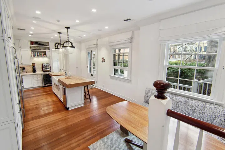 The three-story guest house includes a beautiful staircase.