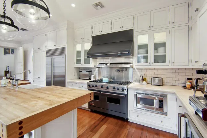 The gourmet chef’s kitchen features a Viking stove, two ovens, a wine cooler, a Sub-Zero refrigerator, a butcher’s block kitchen island, marble countertops, and a pantry with windowed drawers.