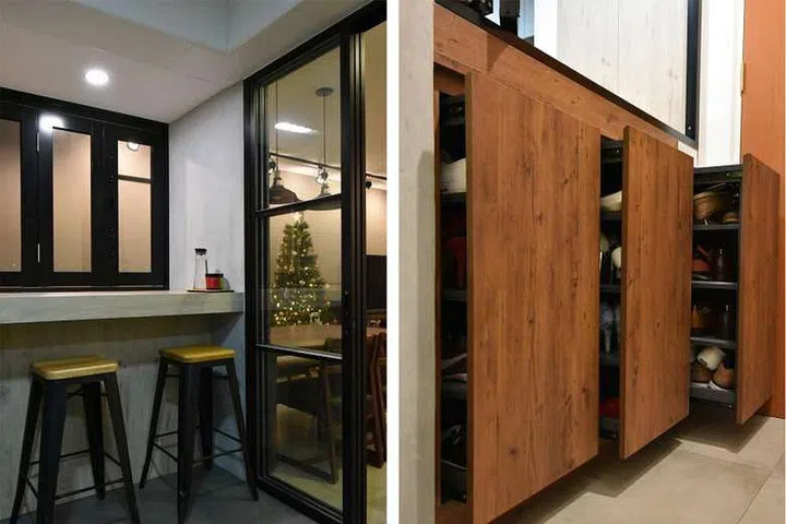 Mr Ow, a customer marketing executive at a multinational corporation and an action and sci-fi movie buff, painstakingly concealed all electrical wiring and the cables of his home theatre system. For the renovation, the couple, who have no children, worked with interior designer Jann Low on building furniture that doubled as storage spaces, such as the wooden bay storage by the window in the open-concept study and the pull-out shoe racks under the breakfast counter.