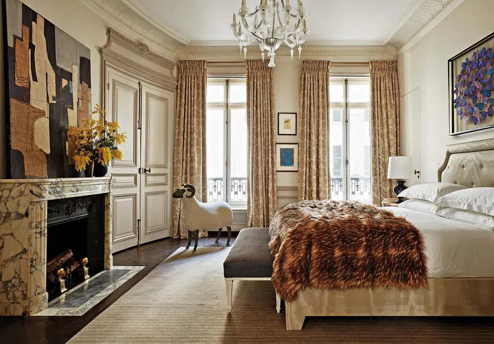 Its interior is quintessentially French, with traditionally French elements such as crown mouldings and overdoors. “We gave it a modern twist, adding modern art works such as abstract collages by French painter, Francis Montanier, and contemporary furniture such as the zebra- print bench," says Laurent.