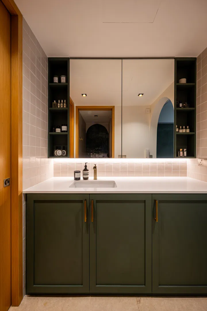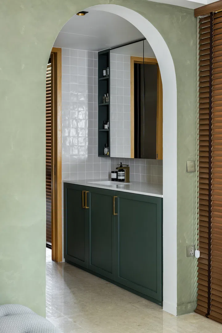 With its curved archway accents, warm back lighting features, gold brass finishings, and an outdoor patio-meets-dining area suiting Singapore’s humid climate year-round, Nicholas’ abode is an example of maximising space in the most stylish way.