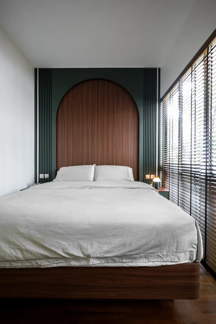The same fluted green design as the kitchen island is brought into the Master, completing the overall design concept. On either side of the bed are two side tables with a lamp. It’s quite minimalist, yet warm, thanks to the colour palette and wood used in the carpentry side of things. There’s a wardrobe to the side for storage.