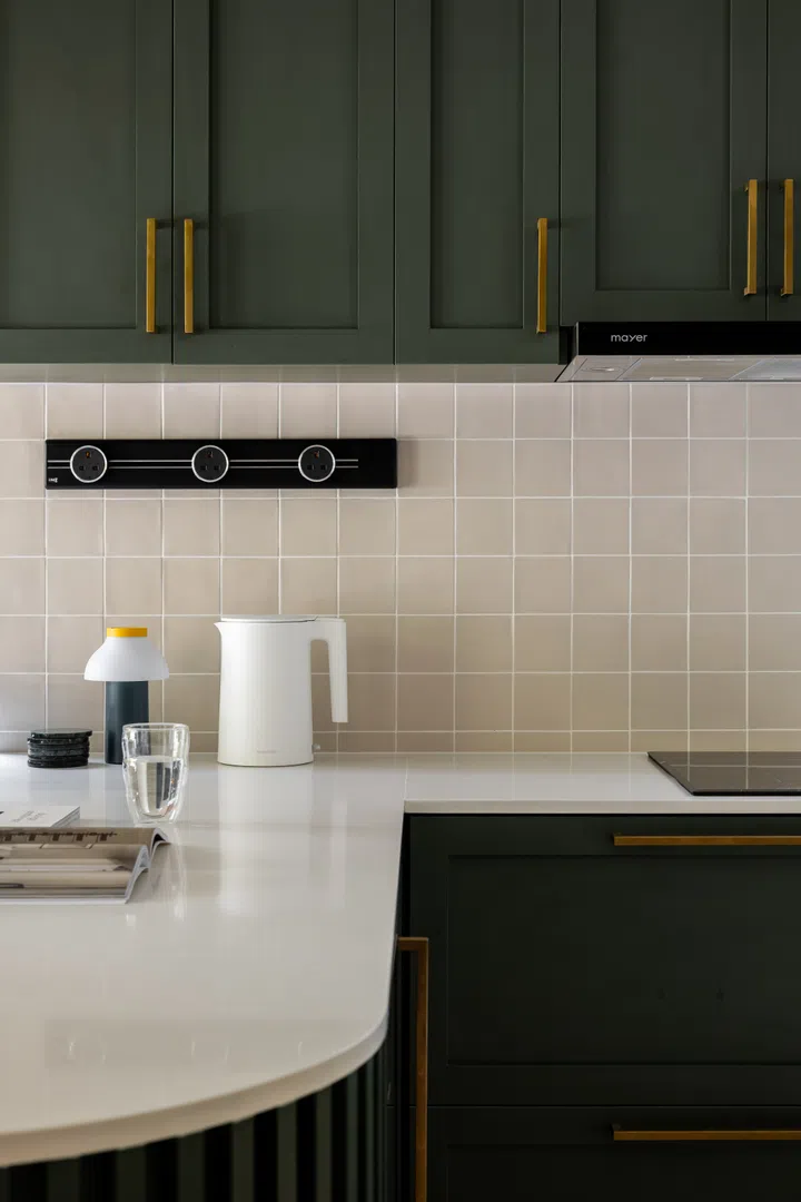 All cabinetry was painted in dollar bill green, contrasted with gold brass handles for a Mid-Century feel. The kitchen wall is tiled in lighter cream, with warm backlighting used around the cooking area.
