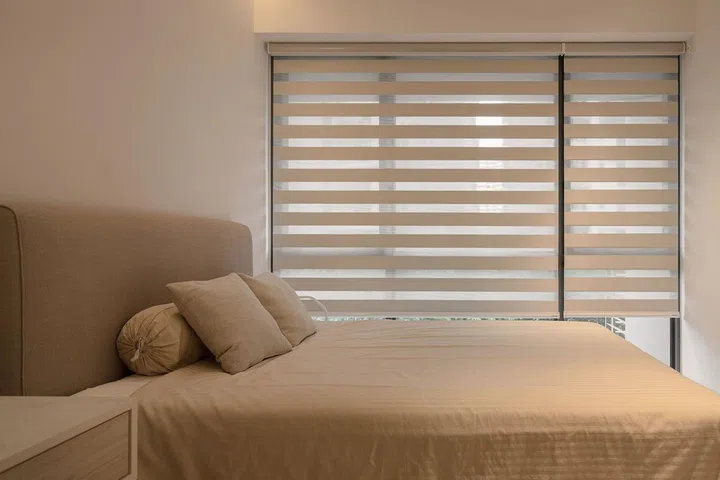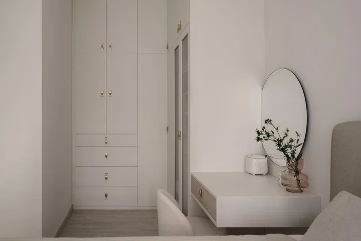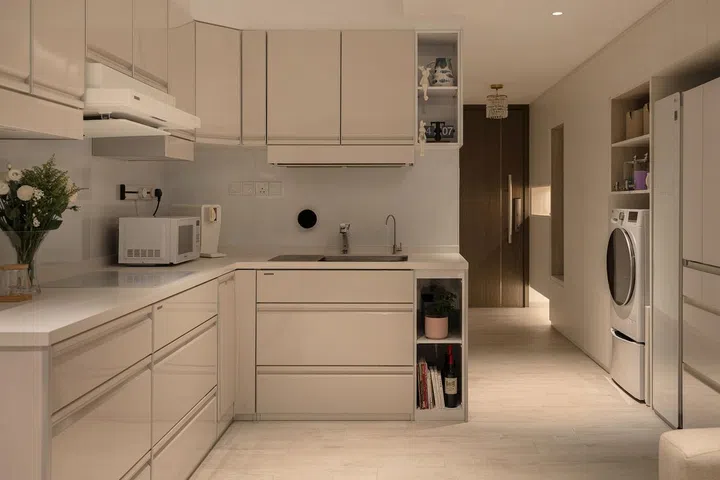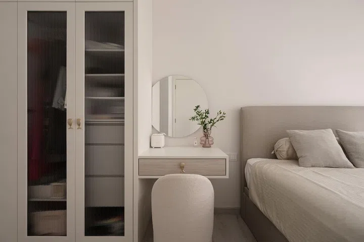 The homeowners expressed a preference for a light-coloured interior and this has been consistently applied throughout the home, from the vinyl floor overlay in a light wood and white walls, to the ivory-coloured kitchen cabinets and light grey bedframe. The use of a light colour palette helps to give the home a more spacious and airier feel.