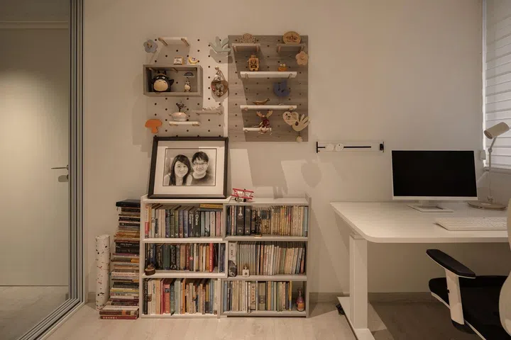One of the bedrooms has been converted into a study room. The original walls were hacked and replaced with slim profile, soft-close sliding glass doors on one side, and windows above a low wall on the other. This allows the flexibility of having the study area closed or opened according to the couple’s needs. Even when closed, the study room still feels connected to the living area thanks to the glass panels.
