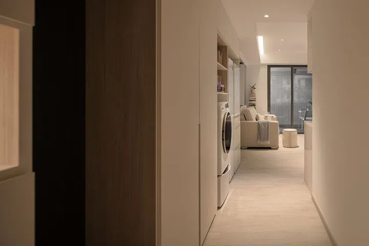 Full-height built-in carpentry line the wall to the left of the main entrance. These not only provide ample storage including a shoe cabinet, but also incorporate a settee. Further along the row, interior designer Simon managed to fit in a washing machine and a refrigerator. In lieu of a yard, there are dedicated shelves above the washing machine for the couple’s laundry needs.