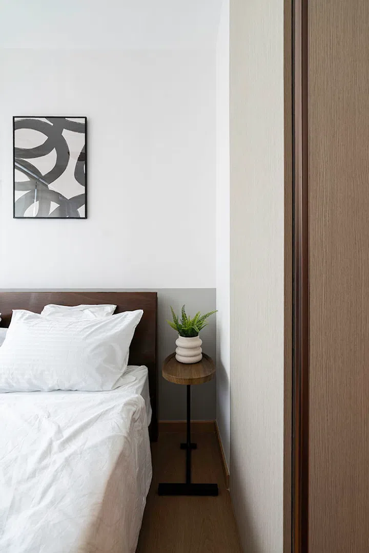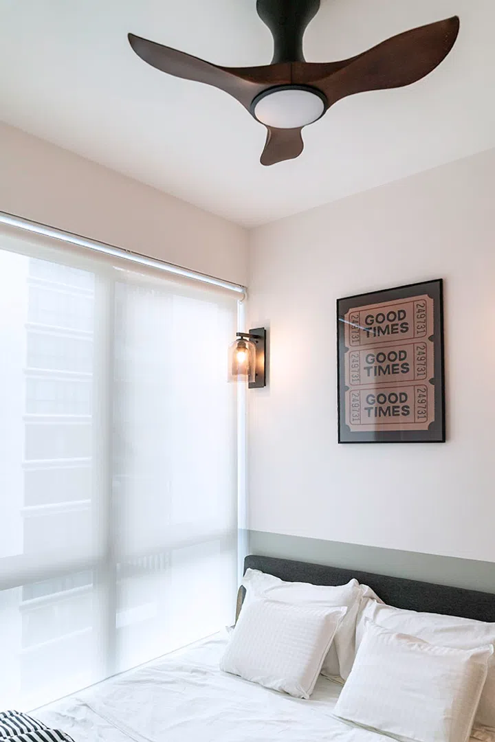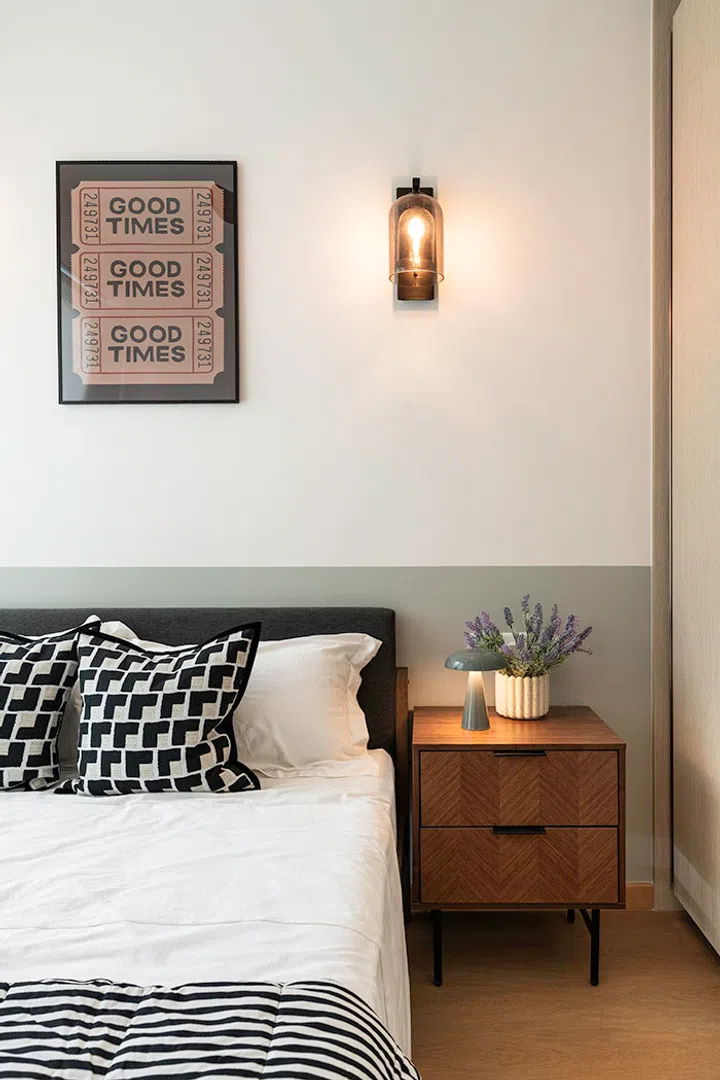 Some interior design choices keep the bedrooms consistent with the rest of the home. For one, both bedrooms were treated to a touch of green on the wall behind the beds. Loose furniture pieces were introduced, with the bedside table, bed and wall light in the master bedroom, to build upon the style.