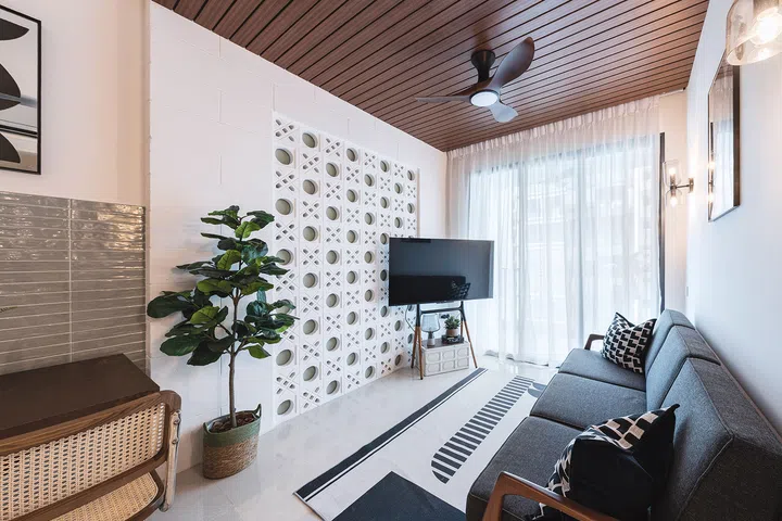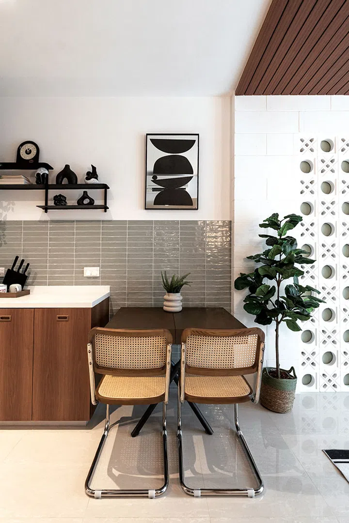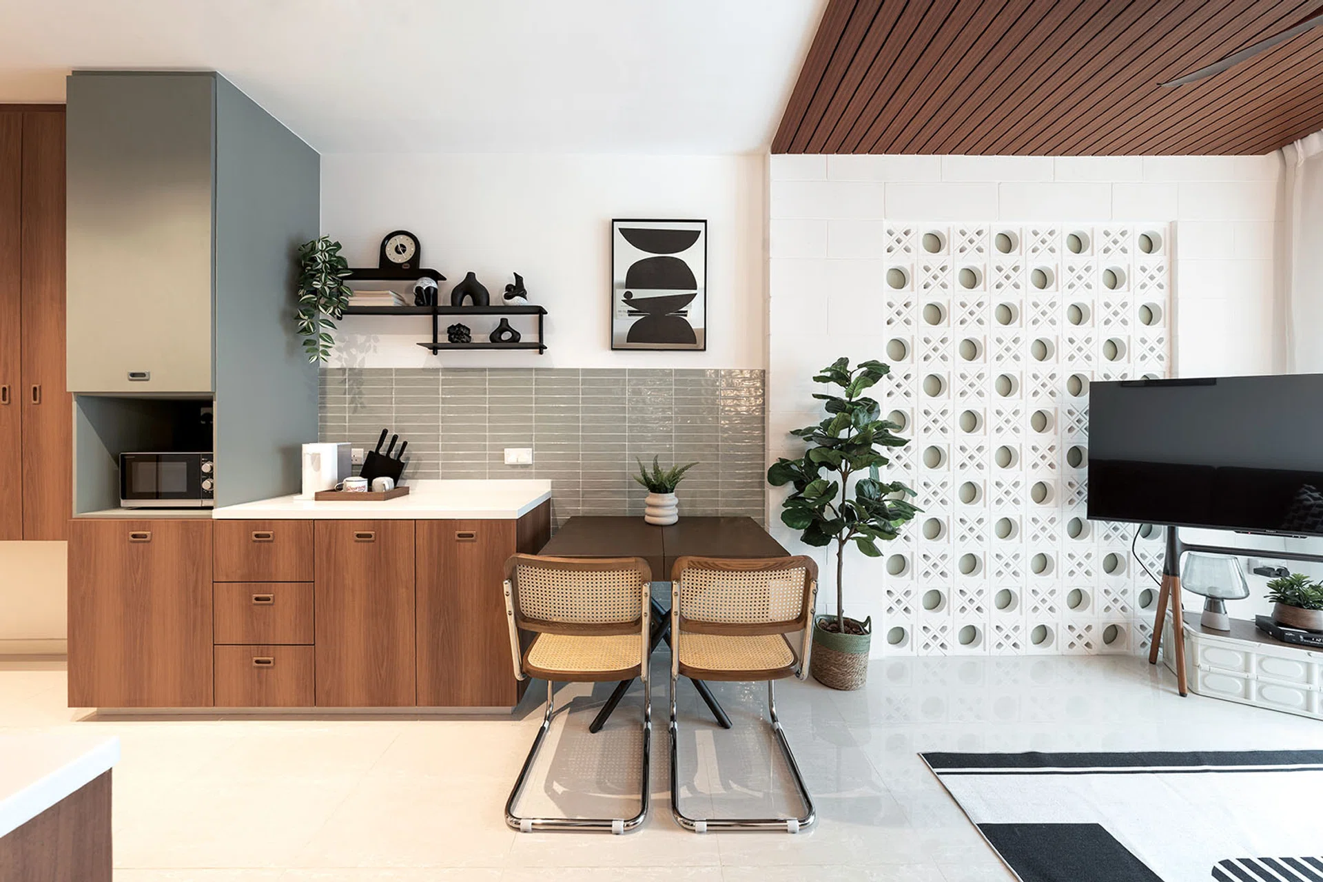 “Given the compactness of the unit, we needed a feature that says ‘mid-century modern’ in a big way,” interior designer Carmen explains. Further into the living room, muted green also makes a subtle appearance behind the breeze blocks. Hollow blocks create a frame around the breeze blocks. Overhead, wooden slats clad the ceiling to demarcate the living area while anchoring the space visually.