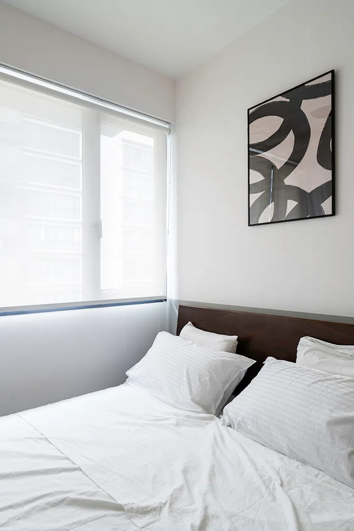 The homeowner also wanted enough space so her parents could be comfortable during their visits. The two bedrooms were furnished sparingly with key furnishings. “Designing for small bedrooms is like dancing in a very cramped bomb shelter – you can’t do major carpentry works, only cosmetic upgrades. Which was what we did, while styling true to our design style,” interior designer Carmen explains.