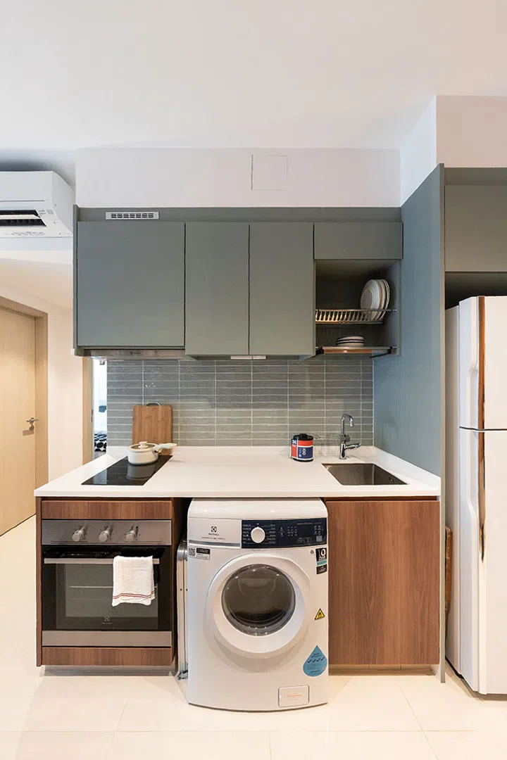 One of the homeowner’s main concerns was the small kitchenette. The interior design must address her storage needs while keeping in mind her goal to keep the living room open and airy without the clutter of built-in cabinets. So, storage cabinets were built on the opposite wall to create a galley-style kitchen. This way, she gets additional countertop space for her cooking needs.