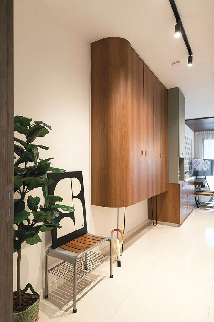 Right beside it, closer to the foyer, is a wall-mounted storage cabinet. The curved edge of the cabinet and the hairpin legs underneath contribute to the mid-century modern look. “This solution maximised storage without compromising the airy feel,” the homeowner says.