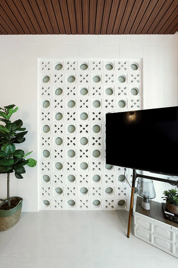 The homeowner says, “The living room is by far my favourite space. I love the unique wall design tiled with breeze blocks, complemented by a wood-panelled ceiling that frames the living area and subtly separates it from the dining space. It’s where I spend most of my time, and it perfectly captures the serene, airy atmosphere I wanted. The balance of textures and warm tones creates a sense of comfort that I look forward to enjoying every day.”