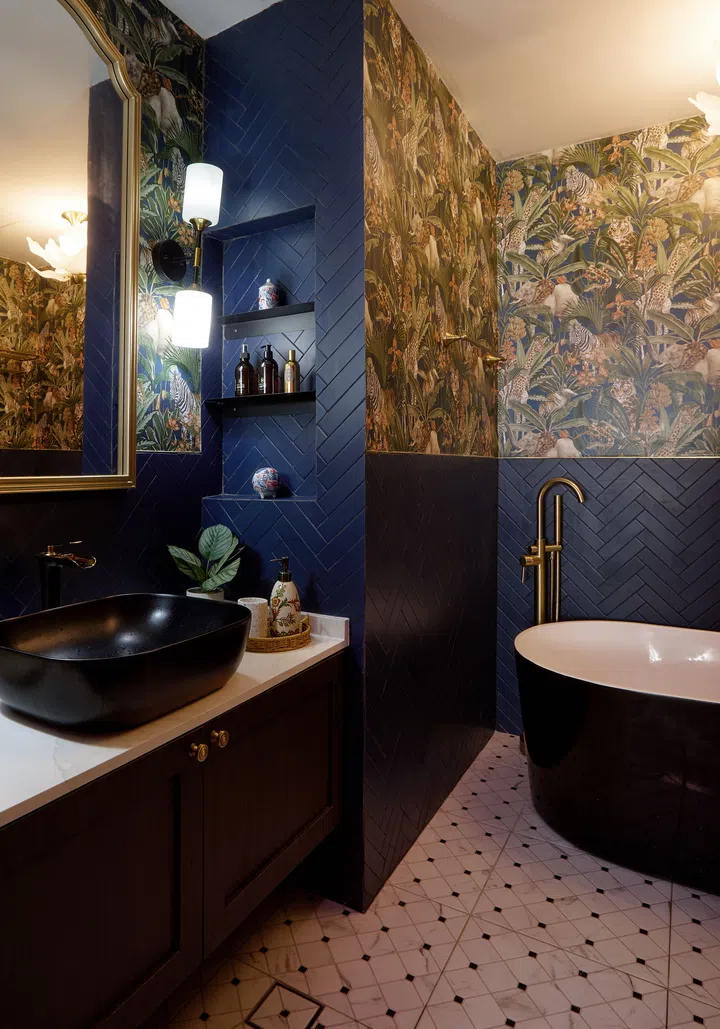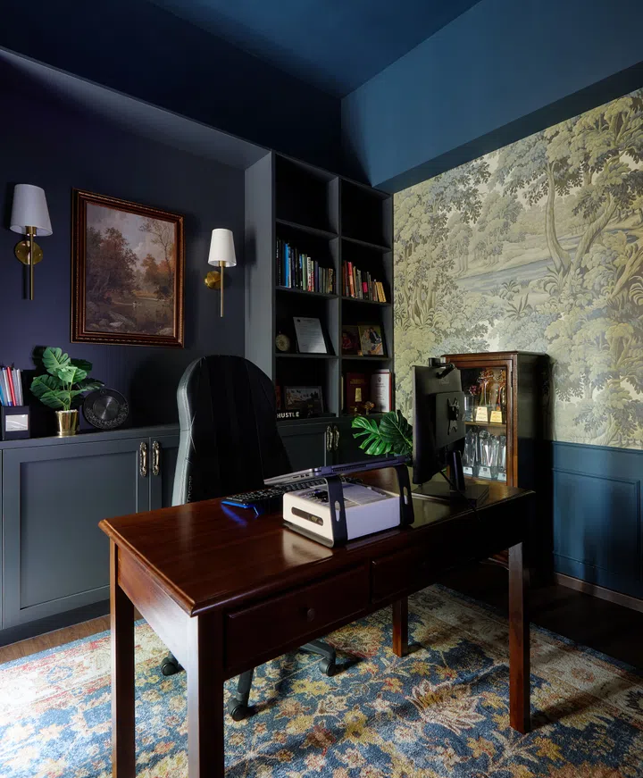 The third bedroom is now a home office and possibly one of the boldest rooms in the home. The walls and built-in carpentry in navy blue evoke a moody and academia atmosphere, along with the golden-yellow hues of the wallpaper and a rug that picks up on the navy blue and gold accents. Michelle reveals that the room reminds them of something straight out of Harry Potter and feels just a little bit magical.