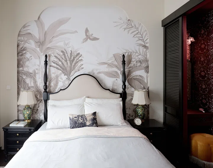 The master bedroom is full of old world charm that transports you back to the colonial era with its black-and-white bedframe with ornate bedposts, a pair of antique side tables and a jungle wallpaper backdrop.