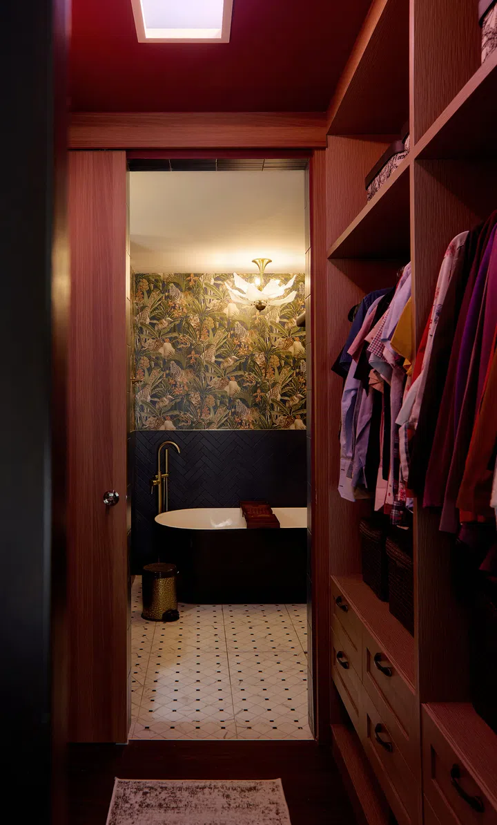 The original walk-in wardrobe wall was relocated to enlarge the space that now incorporates a boudoir-like dressing table surrounded by a deep red wallpaper. An artificial skylight has been built into the ceiling above the walk-in wardrobe, which heightens the intimate nature of the space by giving the illusion of looking up into the open sky.