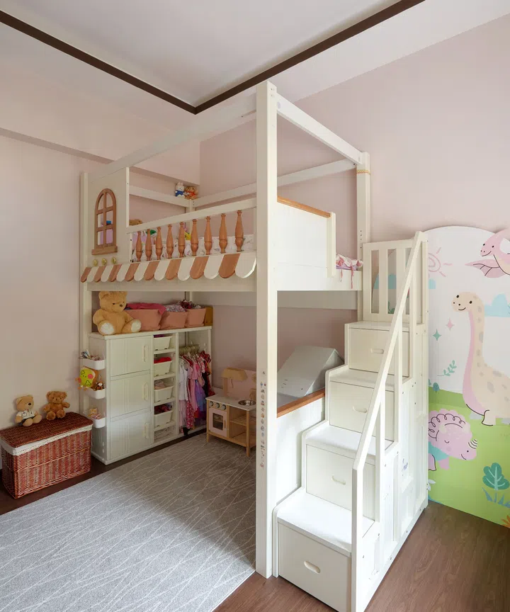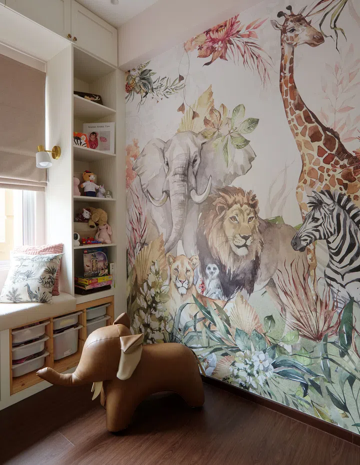 Fun and playful vibes dominate the girls’ bedroom that features colourful wallpaper with safari animals and a double decker structure incorporating a loft bed above a play area and reading nook below.