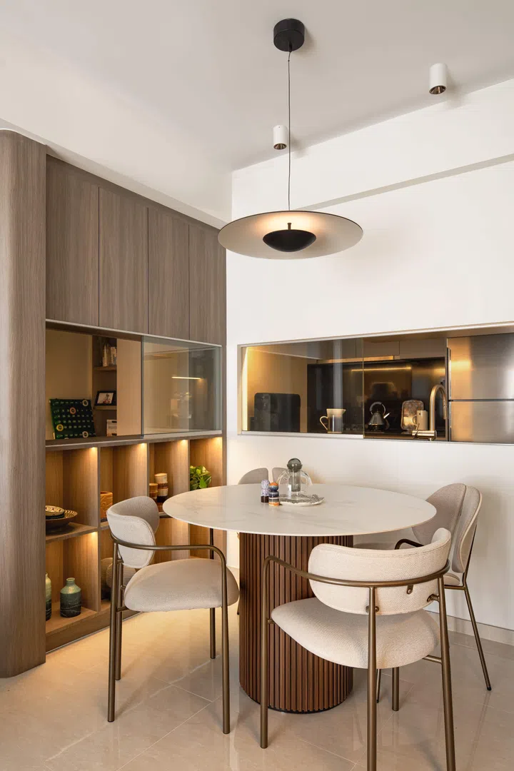 In front of the dining table is a custom-built display shelf, doubling as the study wall with a glass window that slides open. On the dining area side, a cabinet features ceramics, including some from Vietnam.