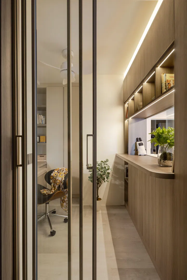 To enter the study (formerly the helper’s room with a small sleeping area and toilet), you walk through glass doors. This allows maximum light to filter through the space, enhanced by the divider wall to the right-hand side with its glass panel.