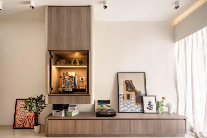 “For the original unit, that side of the wall was empty,” explains Nicholas. “We thought it was a good idea to design not just a place for coffee, but more storage.”