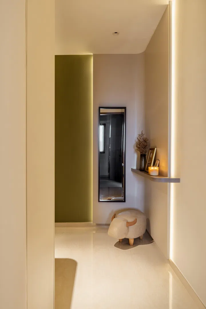 Further pops of colour are created with furniture, decor and wall art illustrations and prints. The Beech Linen sofa is the Adams 2 Seater Sofa from Castlery. Porcelain floors are the unit’s original (as also seen in the dining room and kitchen). Time was spent on false-ceiling works and lighting, including downlights, accent and ambient lighting.