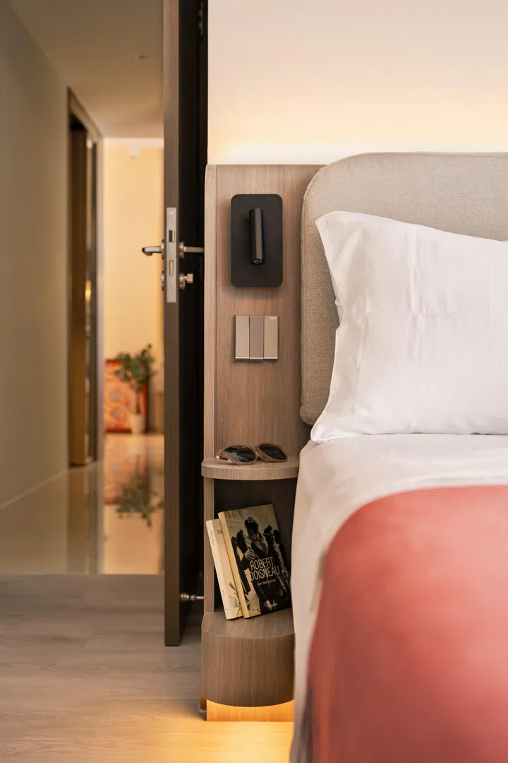 A custom-built laminate-finish console with more storage was built in and added. The interior designer also custom-designed and had her team construct a queen-sized platform storage bed, with a matching headboard and rest, and two curved side tables (a place for the husband and wife’s books, phones, and glasses). These are all built from one panel. On either side of the bed are his and hers reading lights.
