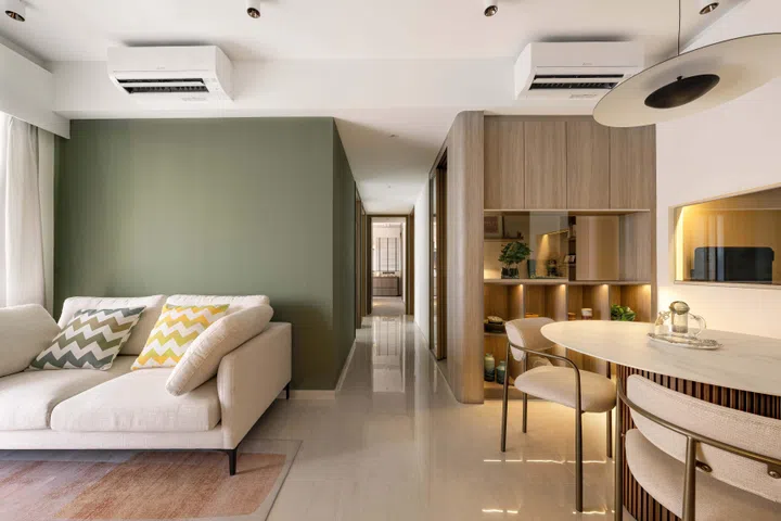 Their home comprises three bedrooms, two bathrooms, a living room that extends into the dining area, study, kitchen, foyer, and balcony. Most of the furniture is new (with a few pieces bought in from their previous home), and sourcing was the effort of both the interior designer and homeowners.