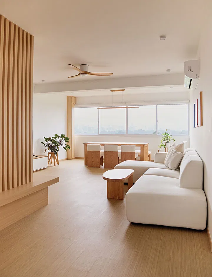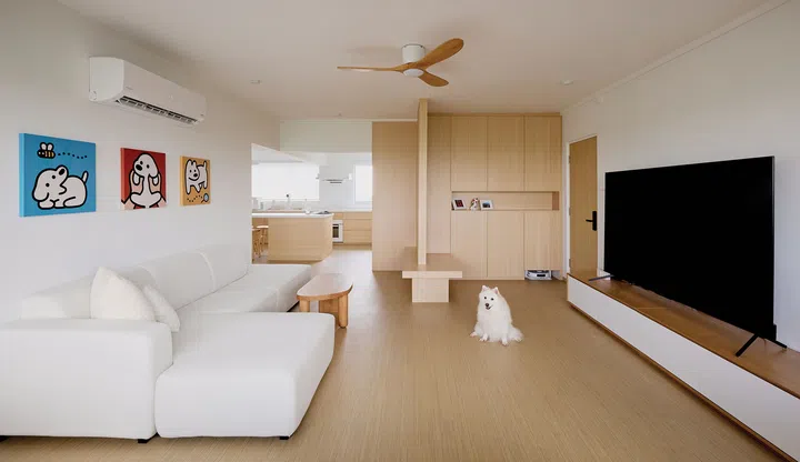 The spacious living area is kept minimalist and uncluttered, with an L-shaped sofa and a small wooden coffee table. The television console almost camouflages with the floor. By keeping the colour and material palettes neutral and restrained, the space takes on a sense of ease and lightness.