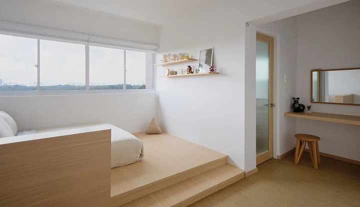 For the master bedroom, Augustine opted for a platform bed that would allow his dog to sleep beside him. The light wood and white walls and ceiling are consistent with the rest of the home and reflective of the Scandinavian-Muji style.