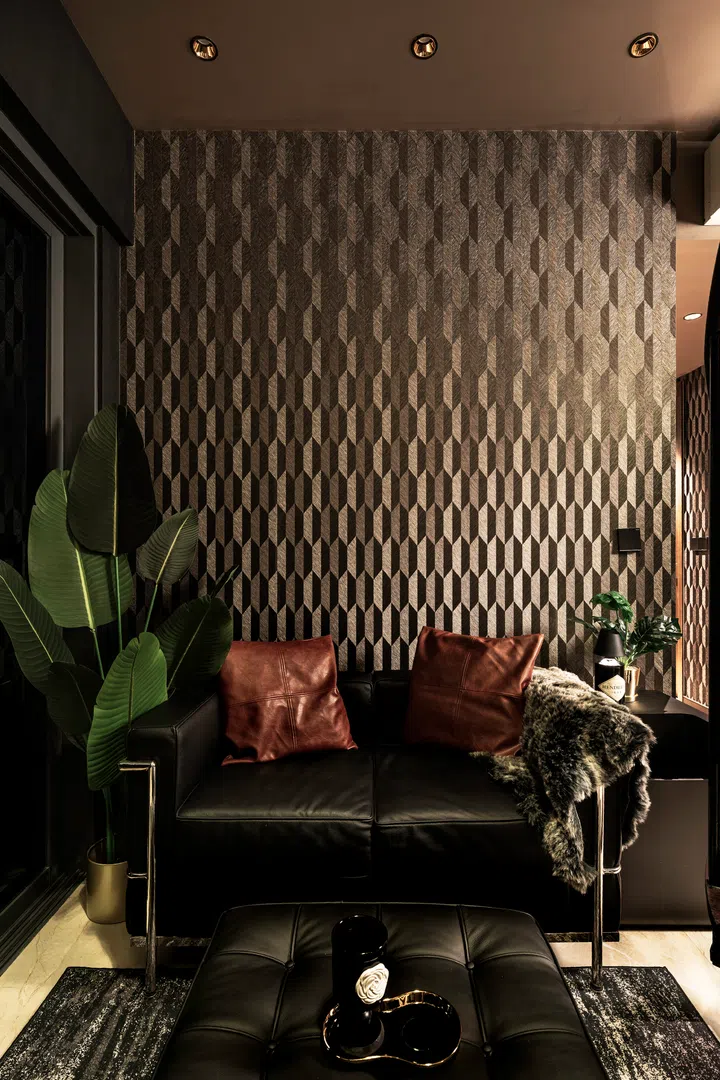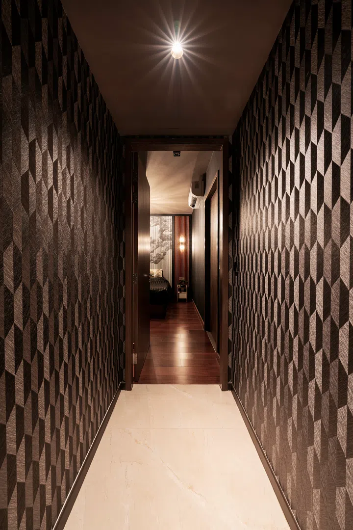 The same wallpaper that adorns the living room wall behind the sofa is extended along the walkway leading to the bedrooms. The metallic sheen and three dimensional effect add depth to the space.