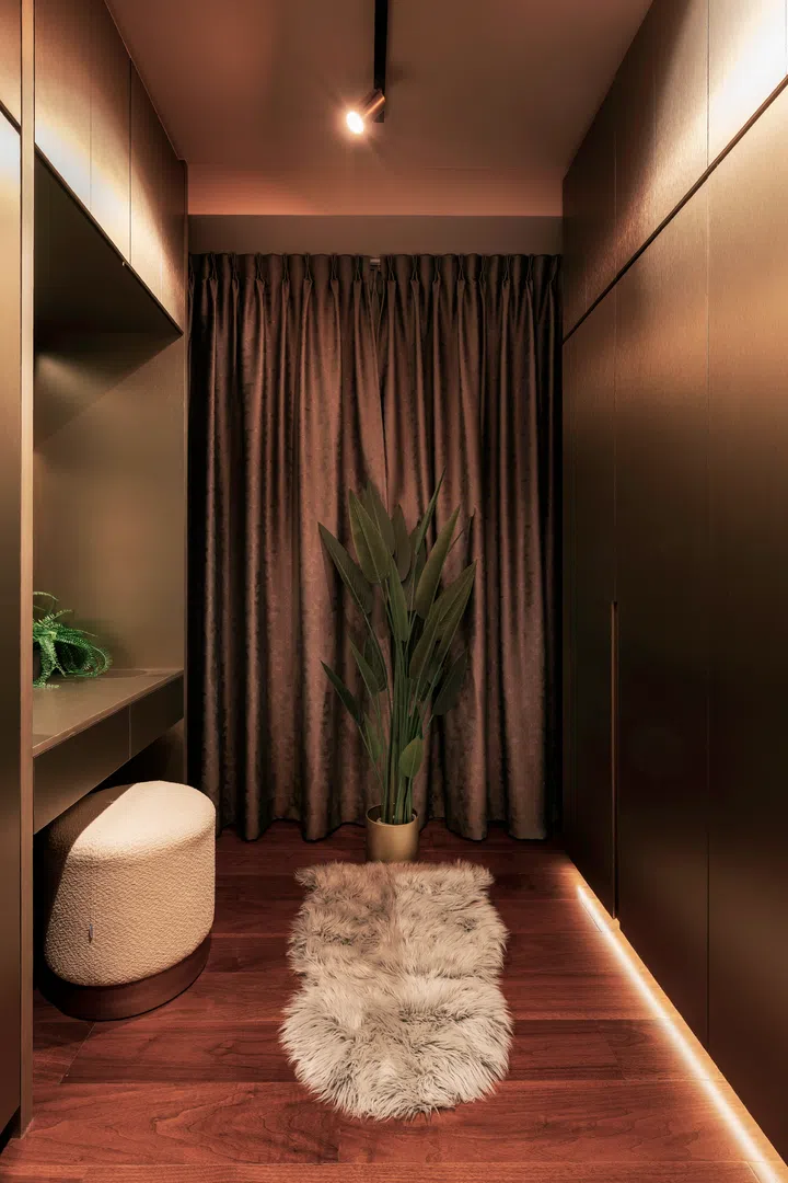 The original door to the bedroom was sealed off and relocated such that the new walk-in wardrobe is now accessible from within the master bedroom. It exudes an understated elegance with a touch of femininity and plants help to soften the space.