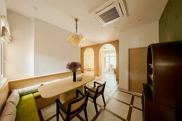 The project focuses on openness and spatial layering expressed through a palette of natural materials. Twin arches frame the main living area, made possible by the discovery of the apartment’s lofty ceiling height during renovation. More than just an architectural expression, these arches also conceal storage within their wooden construction.