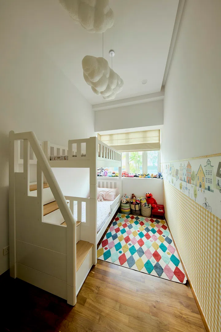 The children’s bedroom and the guest bedroom were initially one large room with an attached bathroom. Nidhi had them reconfigured into separate rooms sharing one bathroom. The couple’s two young children share the bedroom, which was designed to let kids be kids. It is playful, imaginative and sparks curiosity, giving the two young minds room to dream.
