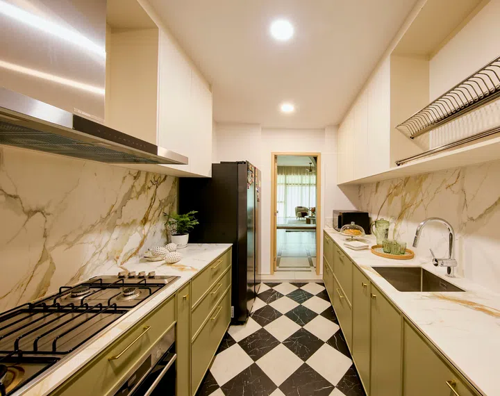 The family does heavy duty cooking frequently, so the kitchen was designed to be functional without compromising on aesthetics. The green cabinetry sets the tone and a checkered black-and-white flooring adds some visual drama to spice things up.