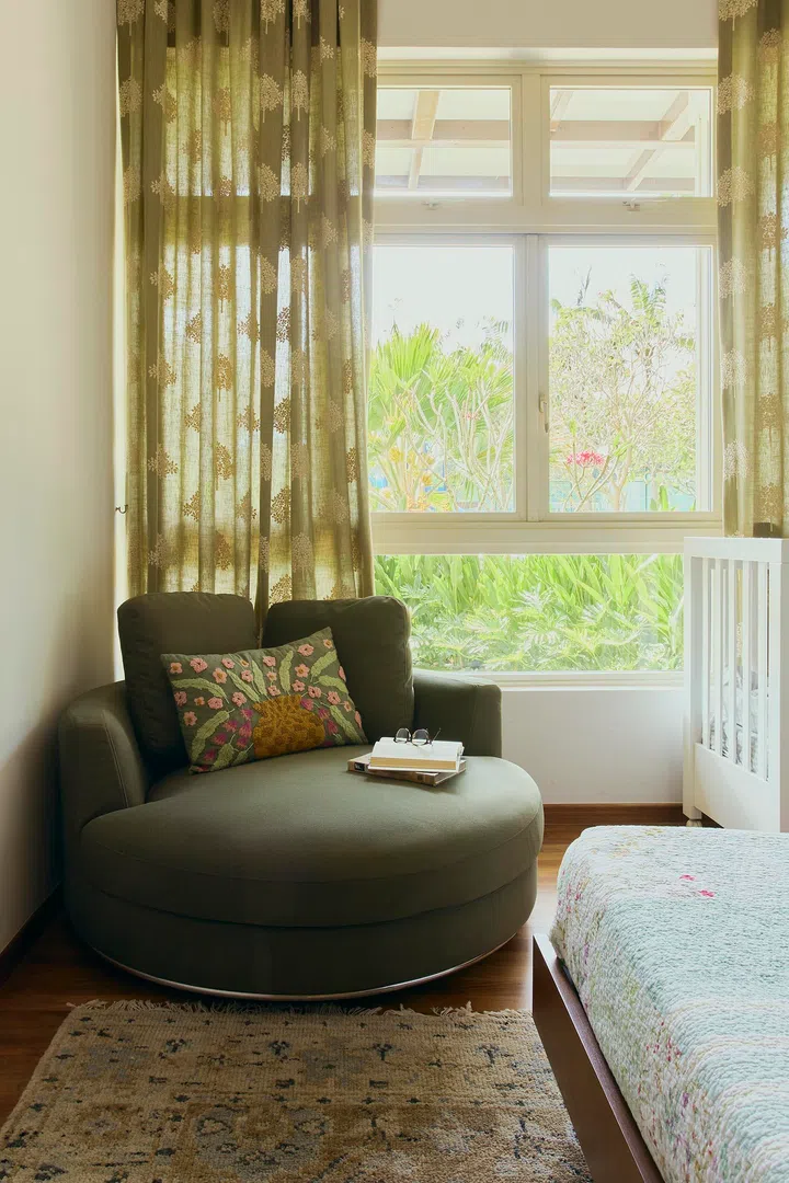 In one corner of the room, a round sofa presents the perfect spot for a quiet moment to read and relax while enjoying a view of the external greenery.