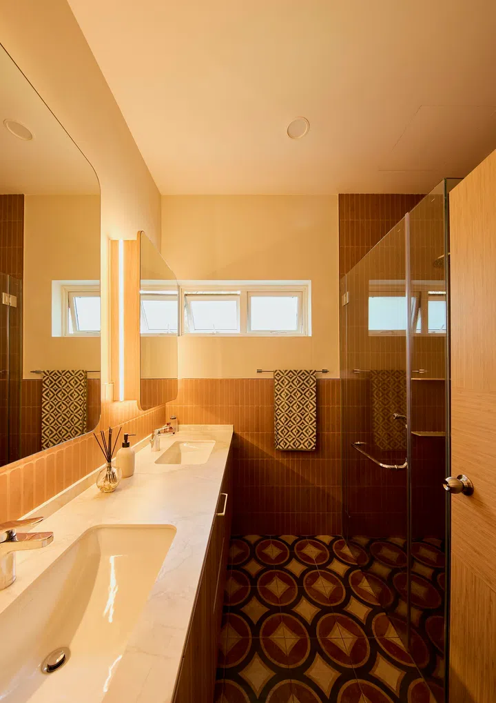 Terracotta inspired tones and a patterned flooring give this bathroom its own unique look that stands out from the rest of the home.