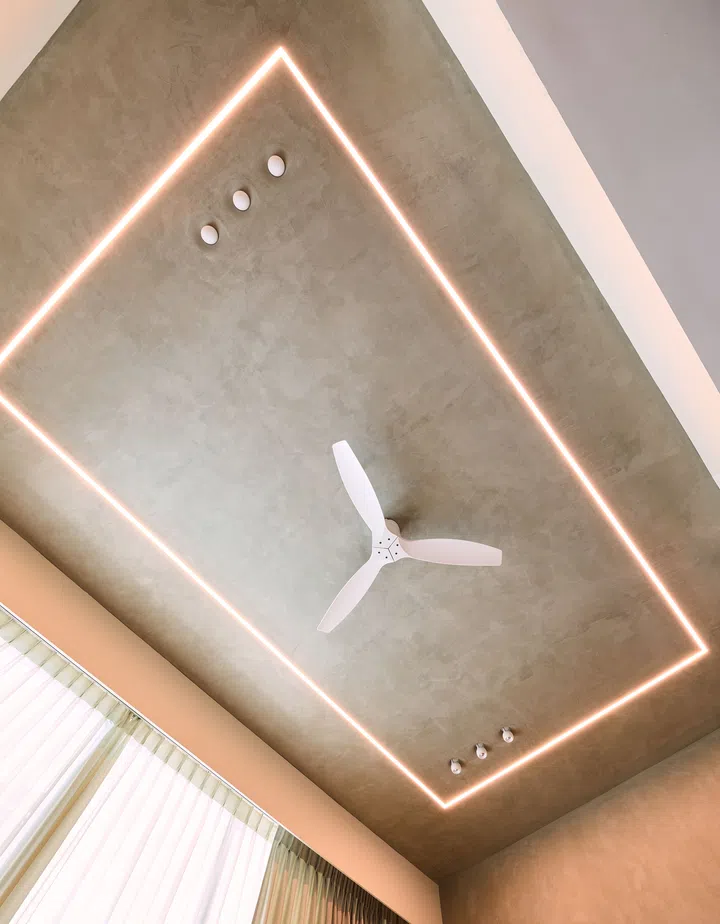 Kelvin conceptualised a lighting strategy for the home comprising spotlights and a continuous flow of LED light strips. They also opted to forgo a television console, keeping the television wall understated with fluted panels.