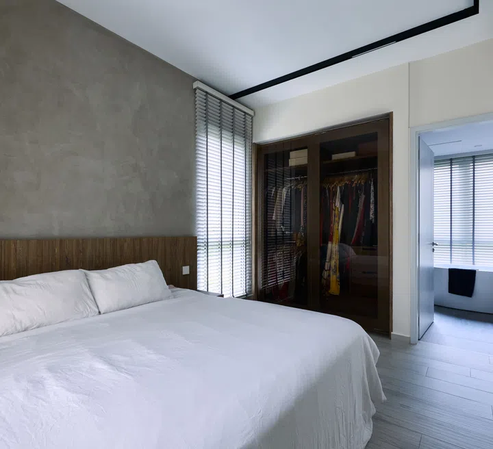 As for the master bedroom, the floating bed design gives the bedroom a light feel, while the semi-transparent glass sliding wardrobe in black anchors the space.