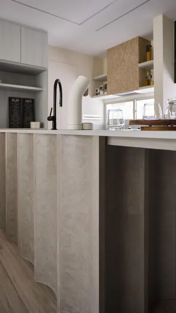One of the most unique design features is the concave design of the kitchen island structure. “It’s custom-made by my carpenter and finished with a screed texture paint. The Caesarstone concrete-looking countertop blends with the colour,” Kelvin shares, highlighting the couple’s unique design preferences.