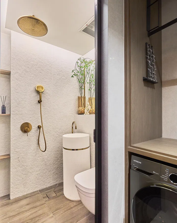 Tucked discreetly behind the kitchen, out of sight from the rest of the home, the yard is a well-organised space with ample storage cabinets for the vacuum cleaner and laundry items, as well as multiple hanging rails for clothes. The door panels with slatted wood addresses ventilation issues.