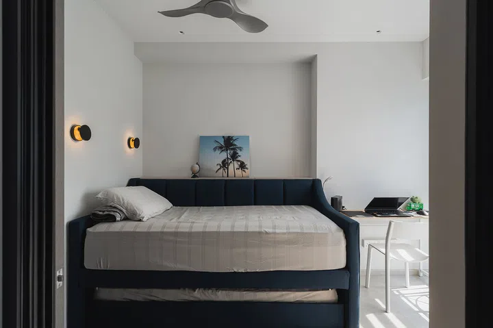 Mrs Lee adds, “My husband and I were trying to get our son to be independent in his own room, so he was involved in the decision-making process for that.” Going with his decision to have the adjacent room, the family also decided to hack down a portion of the wall to connect the two bedrooms. Folding glass doors separate them.