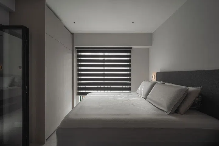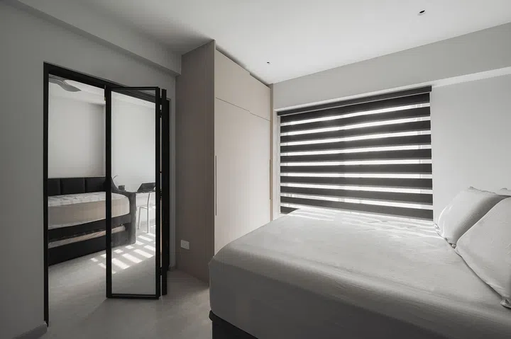 Likewise, the master bedroom is furnished minimally and functional according to their brief. As they had carved out an opening to the other room, the couple chose to have two wardrobes, one closer to the window and the other next to the bathroom entrance. Matte laminates bring a softness to the bedroom feel.