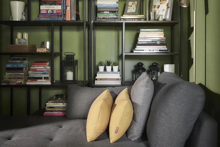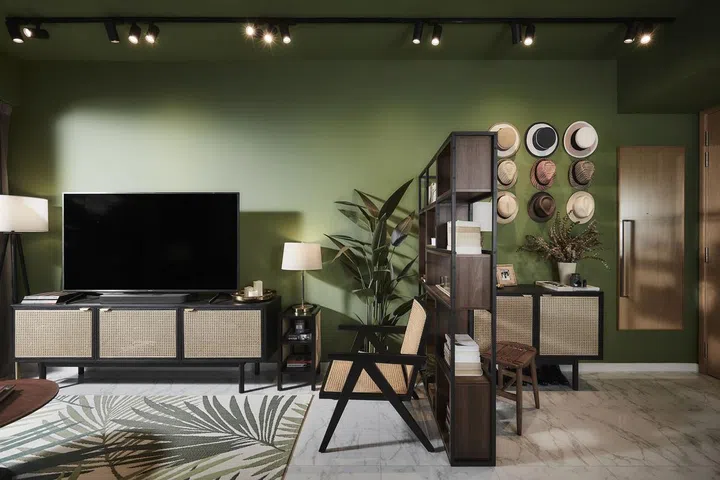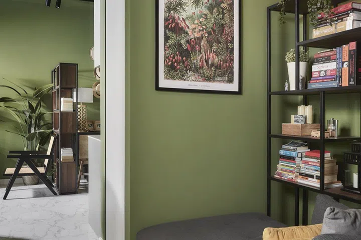Any reservation about all that green being overwhelming is quickly dispelled once you enter the home. The green colour palette makes an impression without being overpowering. This is complemented by other green elements, such as a living room rug with plant motifs and framed prints of flora and fauna above the sofa.