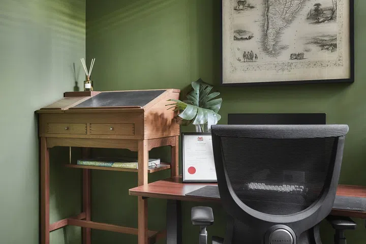 The couple, who moved into their new home in November 2023, decided to designate the second bedroom as a study, which is their favourite space in the home in terms of its aesthetics. Set against the walls and ceiling painted in a deeper and richer Shamrock green compared to the living room is a vintage lawyer’s lectern gifted by a close friend of the couple’s, which they now use as a standing desk.