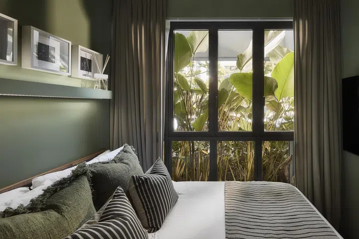 Tropical design goes deeper than just green paint and plant motifs. Interior designer Adrian tried to bring the outdoors into the home, which is extremely appropriate considering the ground floor unit is separated from the condominium’s swimming pool by a lush and verdant screen of foliage.