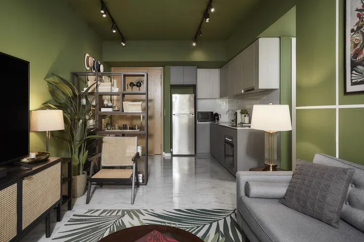 Interior designer Adrian took going green both literally and figuratively. The walls and ceilings of the entire apartment have been painted green. Three different shades of green distinguish the different spaces - a fern-like green for the entrance foyer, kitchen, living room, reading corner and corridor, shamrock for the study room, and an olive hue for the master bedroom.