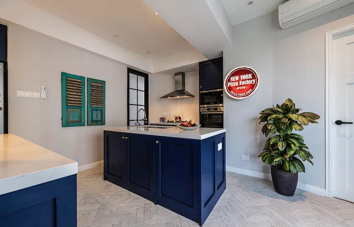 "The kitchen was paved with a rough white brick in a herringbone design, which is offset with the navy carpentry and crisp white countertops," says Arjan.