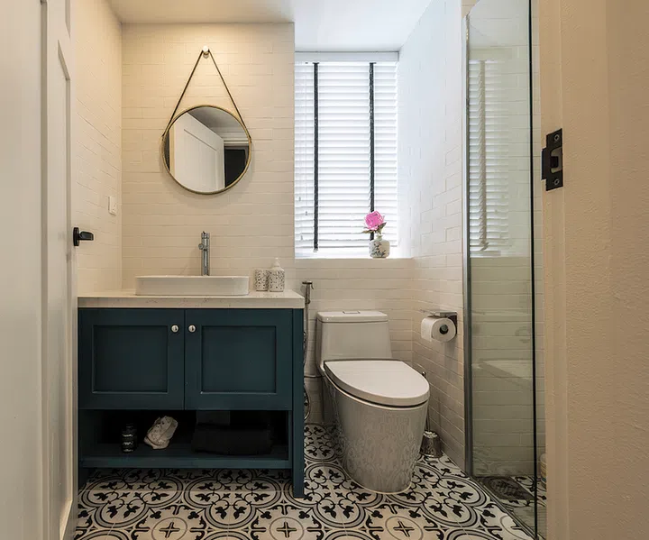 The vibrant colors and intricate patterns of the retro patterned tiles draw the eye, making the floor a captivating feature in the room.