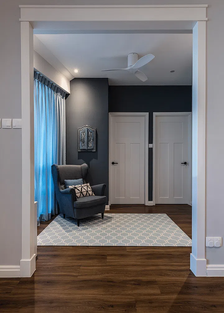 The cool grey paint and dark wood-finished floor, however, gave it a polished look.