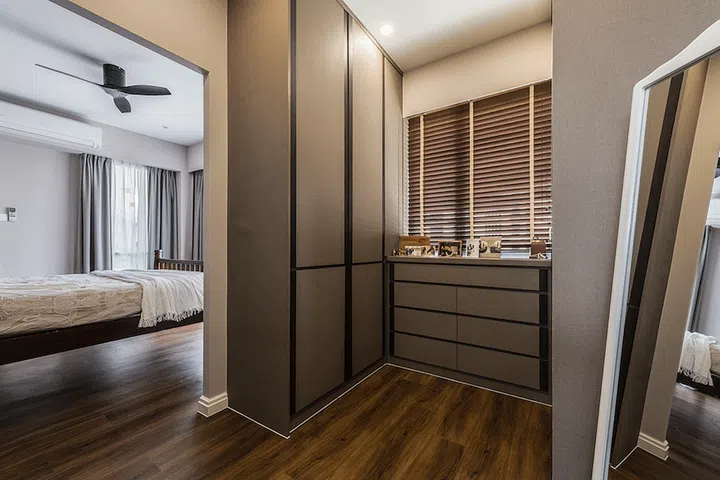 The walk-in wardrobe features grey cabinets with black trim, a captivating and versatile addition to the overall decor.