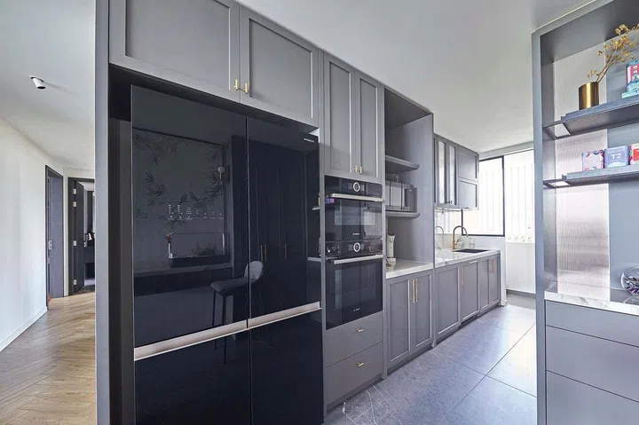 The kitchen underwent extensive renovations. An existing wall separating the dry and wet kitchens was hacked to open up the space.